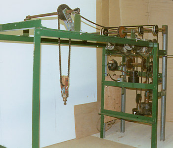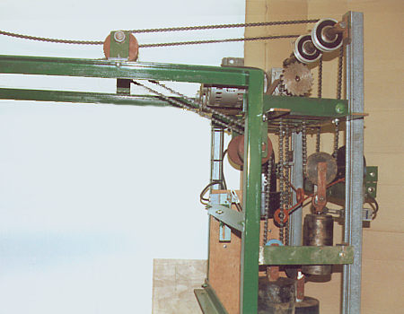 Near the end of its travel, the weight triggers a switch which starts an electric motor that winds the weight and the clock up. The weight is raised until it reaches a second switch which turns the motor off. The Self Winder is now in storage, with the clock, in the church tower. |