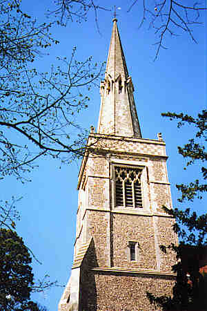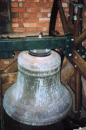 More steep steps lead to the belfry, being very careful not to hit ones head on the girder that crosses the opening. This is lit by large louvered windows, and by the windows high up in the spire. |